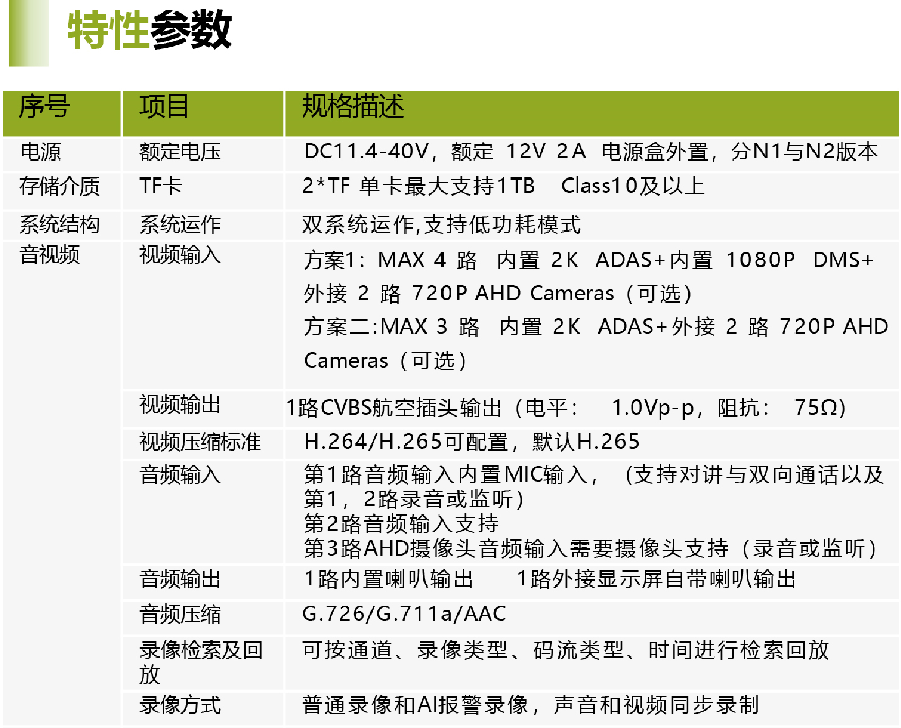 MD300是第二代采用高性能AI处理芯片的新方案AI Dashcam;该产品是一款双系统(双通信通道)、高稳定性的高 清车载录像机,具备最高支持4路的H.264/H.265视频压缩/解压缩、4G、GPS、WiFi、蓝牙、宽电压、高压保护等技术, 新一代无线车载视频监控解决方案的核心产品。 广泛应用于公交车、长途客车、出租车、物流车、特种车辆(如运钞车)、私家车、叉车等各种移动视频监控领域。 产品特性: 内置1080p分辨率DMS摄像头,2K分辨率ADAS摄像头; 内嵌高性能AI视频处理芯片(可选配AI视频算法:ADAS、DMS); 支持TF卡,最大支持2*1TB容量,自带TF卡槽; 可扩展支持2路720P摄像头; 采用工业级别的电源芯片,支持11.4~40V 电源输入,适应苛刻环境; 支持本地录制和网络传输的双工作模式; 内置传感器,可用于司机驾驶行为状态检测; 采用自主研发数据写入机制,有效保护录像数据,防止系统异常断电导致数据丢失